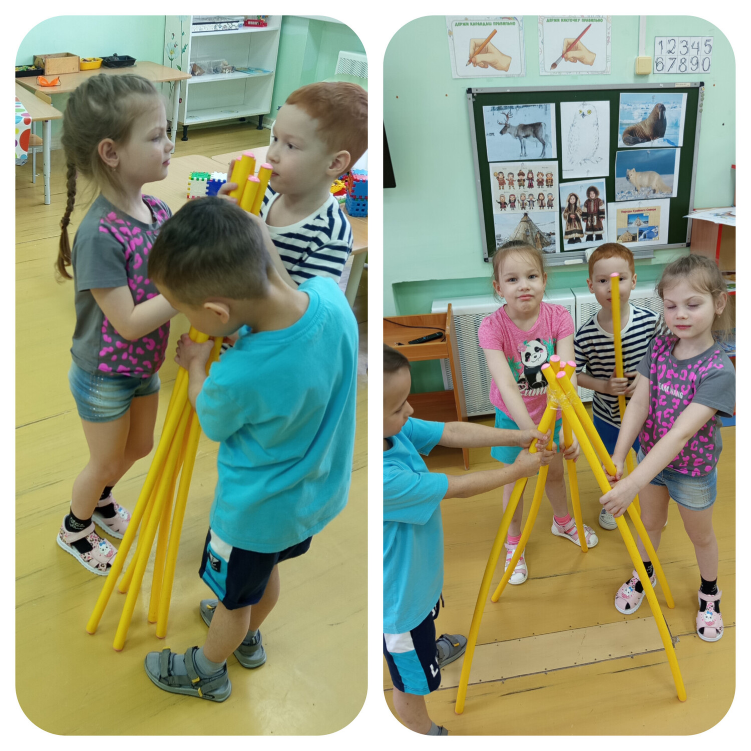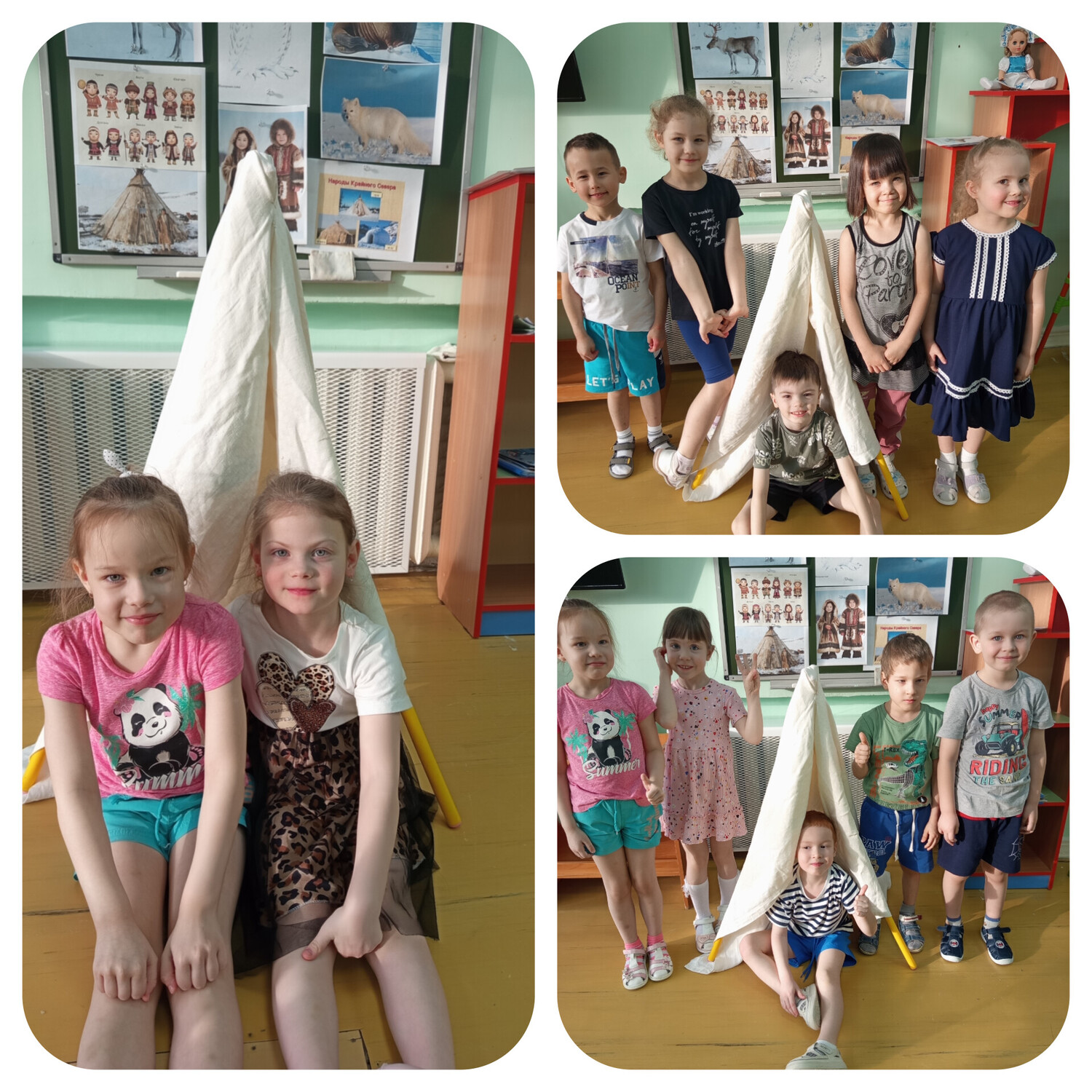 В группе "Звёздочки" прошлая тематическая неделя "Знакомство с народами Севера". Ребята в ходе беседы и просмотра презентации познакомились с традициями, культурой и образом жизни народов Севера нашей страны. Дети играли в национальную игру "Догони варежку", попробовали сами построить традиционное жилище "Чум".
